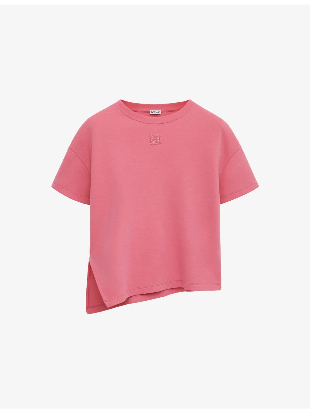 PRODUCT DETAILS - LOEWE cotton-blend T-shirt - 80% cotton, 20% polyamide - Relaxed, boxy fit, round neck, short sleeves, logo embroidery, asymmetric cut-out hem - Machine wash cold - True to size - Lightweight, non-stretch Ref: R04567049