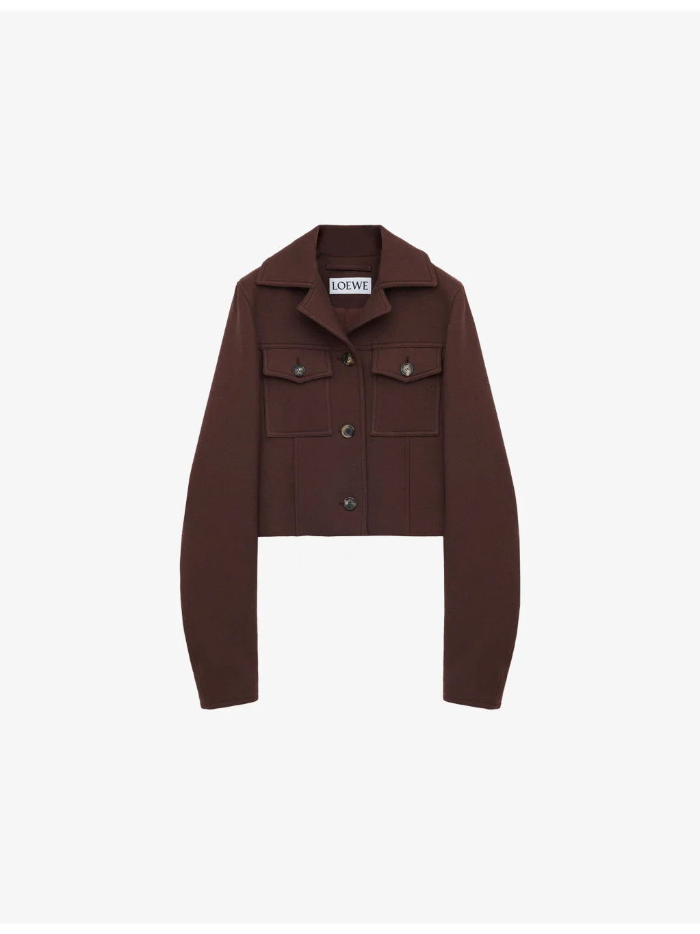 PRODUCT DETAILS - Loewe wool-blend jacket - 97.02% wool, 2% calf leather, 0.98% silk - Exposed button fastenings at front - Regular fit, notch collar, long sleeves, two chest flap buttoned pockets, exposed seams, Anagram-embossed leather logo patch at back, cropped - Dry clean - True to size - Midweight, non-stretch Ref: R04566953