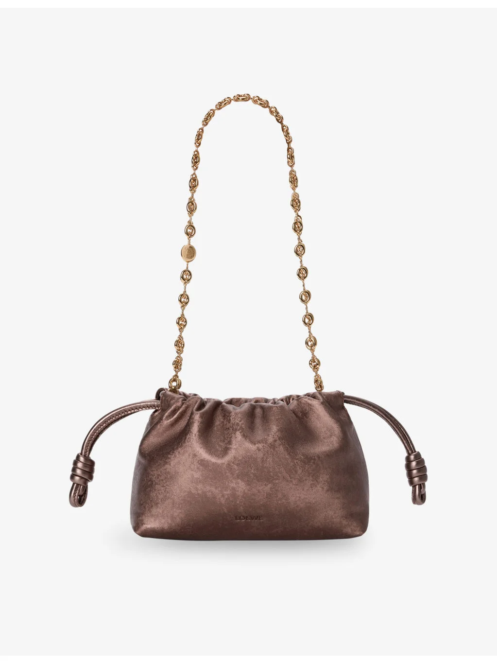 PRODUCT DETAILS - Loewe leather shoulder bag - 100% leather - Magnetic fastening - Drawstring top, chain strap, logo embossment, one main compartment, metallic finish - Height 14cm, width 21cm, depth 8cm - Specialist leather clean Ref: R04567254