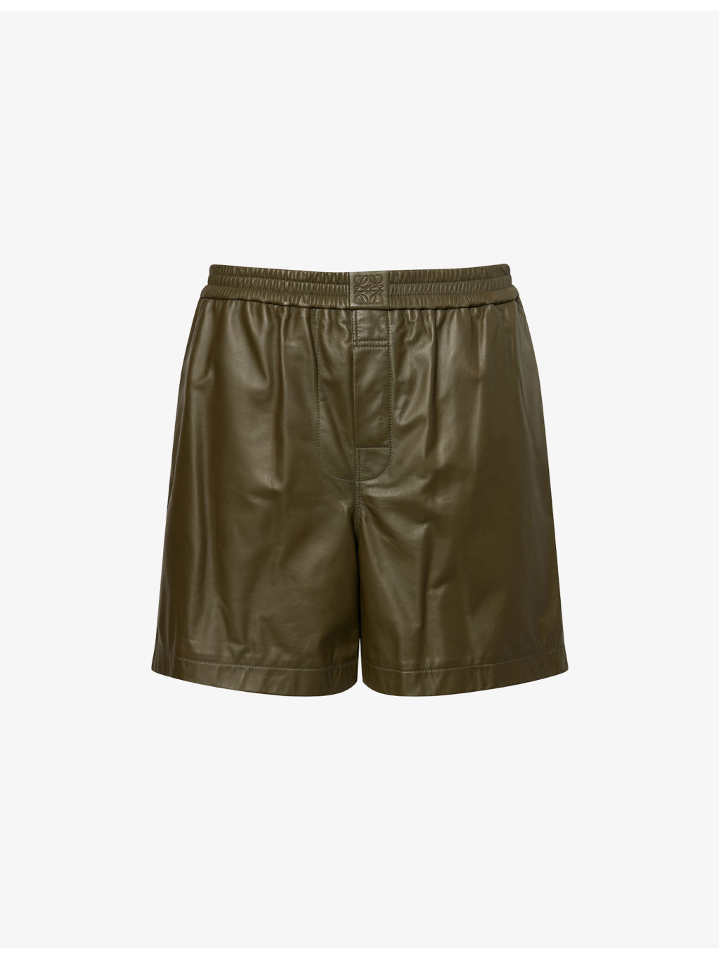 PRODUCT DETAILS - Loewe leather shorts - 100% lamb leather; lining 100% viscose; pocketlining 100% cotton - Relaxed fit, high-rise, elasticated waistband, two slip pockets and debossed branding at front, patch pocket at back, all-over smooth leather, fully lined - Specialist leather clean - Made in Spain - Size medium: rise 14in / 36cm, inside leg 6in / 15cm, leg opening 28in / 72cm - Model is 6ft 2in/1.88m and wears a size medium - Lightweight, non-stretch Ref: R04494981