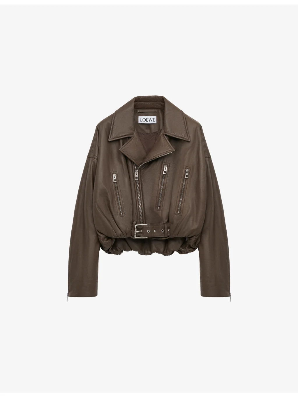 PRODUCT DETAILS - Loewe leather jacket - 100% leather - Exposed zip fastening at front - Notched collar, long sleeves, zipped at cuffs, four zipped pockets at front, adjustable buckle at waist, balloon silhouette, silver-toned hardware, lined - Specialist leather clean - Made in Italy - True to size - Midweight, non-stretch Ref: R04566911