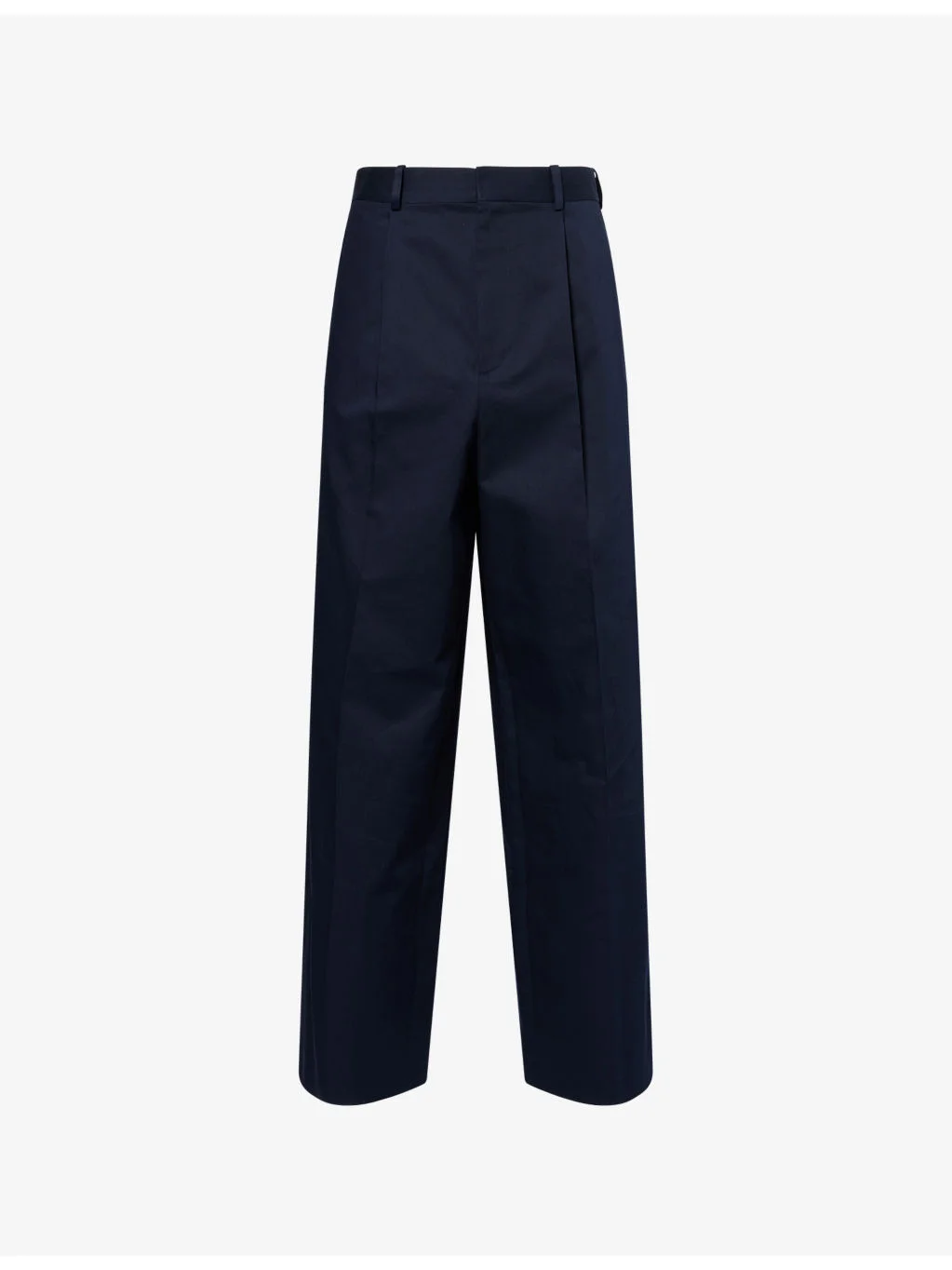 PRODUCT DETAILS - Loewe cotton trousers - 100% cotton - Button, hook-and-eye and zip-fly fastening - Wide leg, belt loops, side pockets, back button and welt pocket, pleated front - Dry clean - Size 32: rise 16in / 40cm, inside leg length 31.5in / 80cm, leg opening 24in / 60cm - Model is 6ft 2in/1.88m and wears a size UK 32 - Midweight, non-stretch Ref: R04565722