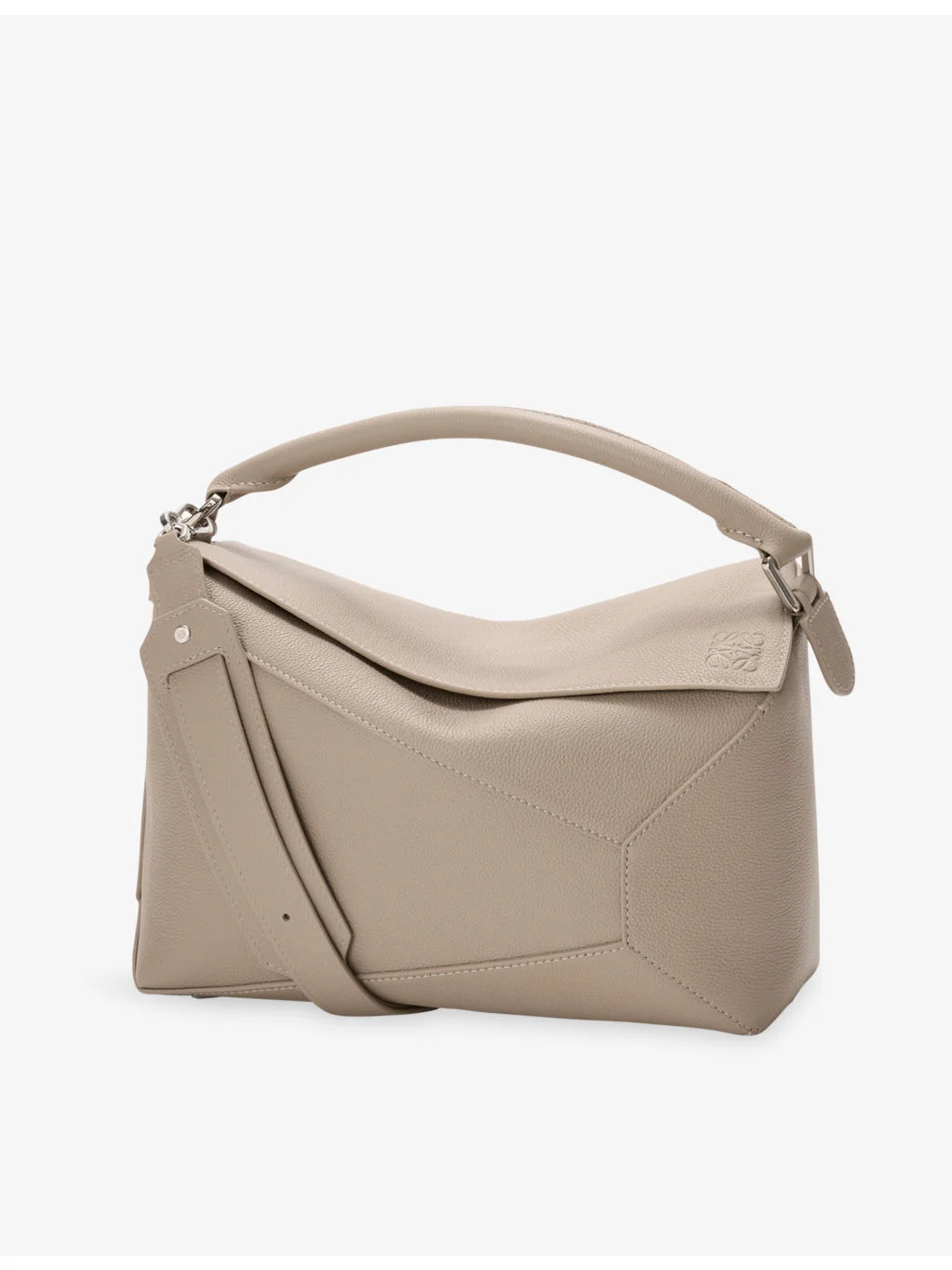 PRODUCT DETAILS - Loewe leather shoulder bag - 100% calf leather - Zip fastening - Cuboid shape, top handle, detachable and adjustable shoulder strap, overlapped panels, single-stitch lines, one main compartment, embossed logo, one exterior zip rear pocket, two interior slip pockets, herringbone cotton canvas lining, grained finish - Height 19.5cm, length 14cm, depth 29cm - Specialist leather clean - Made in Spain Ref: R04567069