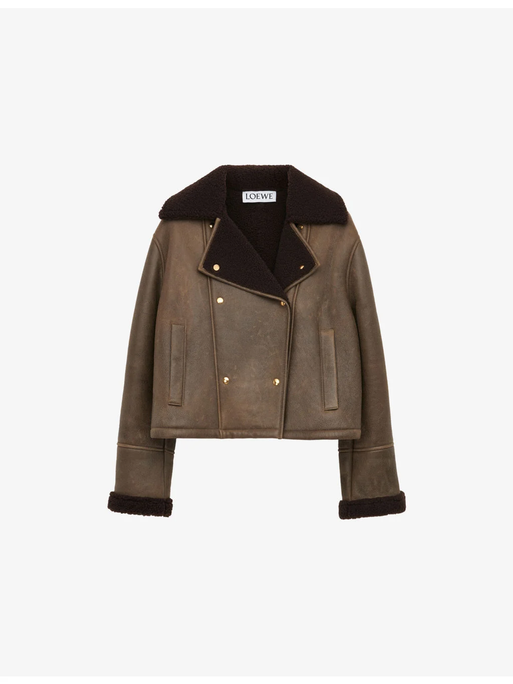 PRODUCT DETAILS - Loewe leather jacket - 100% lamb leather; lining 100% shearling - Boxy fit, notched collar, long sleeves, two welt pocket at front, shearling lined, gold-toned hardware - Specialist leather clean - Made in Italy - True to size - Midweight, non-stretch Ref: R04566925