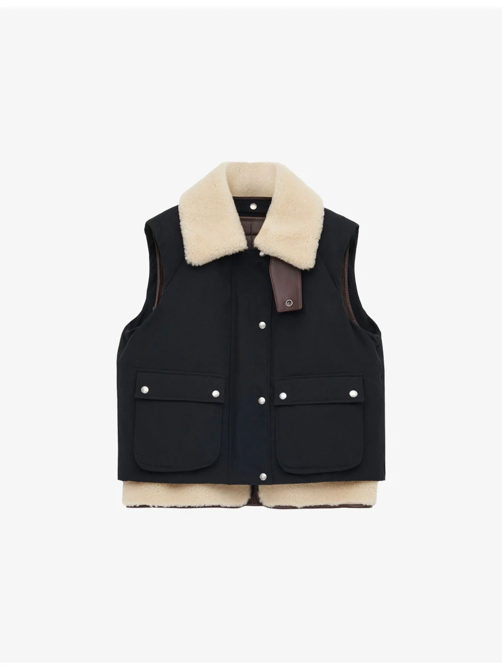PRODUCT DETAILS - Loewe leather and cotton gilet - 60% lamb leather, 24% cotton, 16% polyamide - Concealed zip fastening and exposed press-stud fastening at front - Shearling collar, sleeveless, two patch pockets at front, lined - Specialist leather clean - Made in Italy - True to size - Midweight, non-stretch Ref: R04566947
