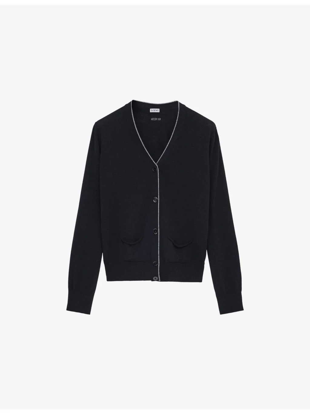 PRODUCT DETAILS - Loewe wool knitted cardigan - 100% wool - Button fastening - V-neck, long sleeves, two patch pockets at front, striped ribbed trims - Dry clean - Made in Italy - True to size - Lightweight, stretchy Ref: R04567009