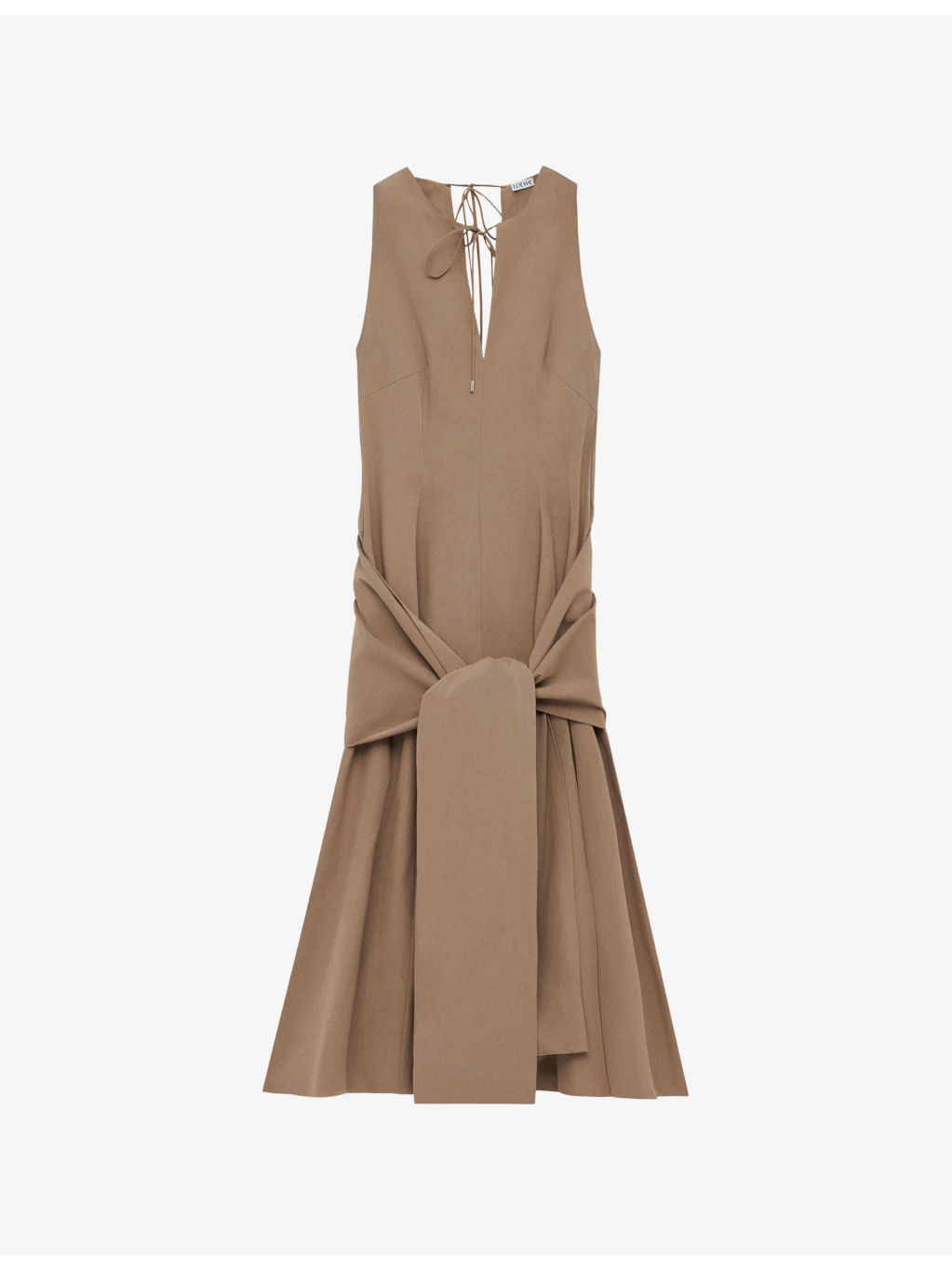 PRODUCT DETAILS - Loewe cotton midi dress - 100% cotton - Slim fit, crew neck, sleeveless, wrap self-tie at front, keyhole at back with ties, flare hem - Machine wash cold - True to size - Model is 5ft 10in/1.78m and wears a size UK 8 - Lightweight, slight stretch Ref: R04493238