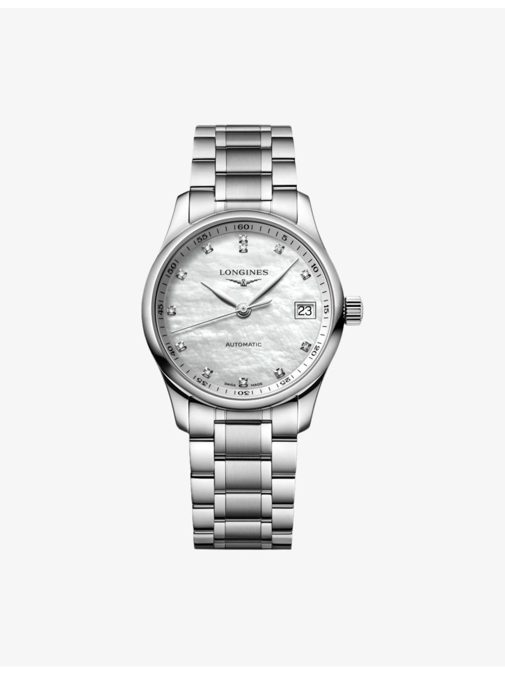 PRODUCT DETAILS - Longines stainless-steel and 0.055ct diamond automatic watch - Case material: 100% stainless steel - Strap material: 100% stainless steel - Crown material: 100% stainless steel - Style Number: L2.357.4.87.6 - Movement type: automatic - Fastening: triple safety folding clasp and push-piece opening mechanism - Dial: round, white mother of pearl - Hands: Silvered polished hands - Index: Diamond indexes - Glass: scratch-resistant sapphire crystal, with several layers of anti-reflective coating on both sides - Calibre: L888 - Stones: 13 Wesselton VS-SI diamonds - Carat weight: 0.055ct total - Date window: yes - Case thickness: 9.20mm - Case diameter: 34.00mm - Water resistance: 3 bar / 3 atm / 30m / 100ft - Made in Switzerland - Returns: 5 years, warranty card & diamond certificate to be included with return. Ref: R04473109