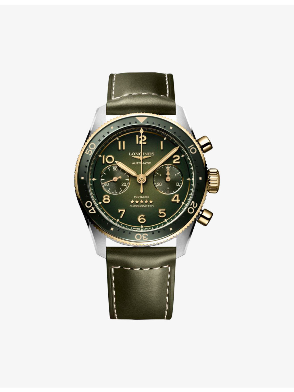 PRODUCT DETAILS - Longines stainless-steel automatic watch - Case material: 100% stainless steel - Strap material: 100% stainless steel - Crown: 100% stainless steel - Bezel: 100% Ceramic and 18ct yellow-gold cap - Style Number: L3.821.5.53.2 - Movement type: automatic - Fastening: double security folding clasp with micro adjustment system - Dial: Green - Index: painted Arabic numerals - Hands: Gilt hands - Glass: scratch-resistant sapphire crystal, with several layers of anti-reflective coating on both sides - Calibre: L791 - Case thickness: 17.00 mm - Case diameter: 42.00 mm - Technical details: COSC Certified, Flyback chronograph, small seconds at 9 o'clock - Water resistance: water-resistant to 10 bar (100 m) - Made in: Switzerland - Warranty: 5 years - Returns: Warranty card and COSC Certificate to be included with return. Ref: R04472686