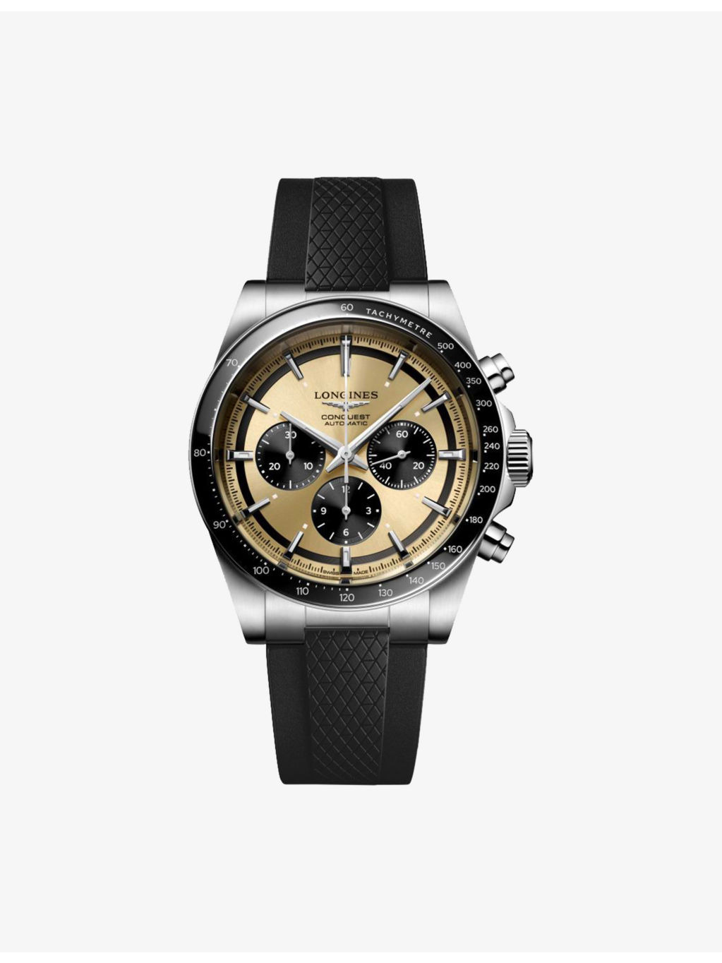 PRODUCT DETAILS - Longines stainless-steel automatic watch - Case material: 100% stainless steel - Strap material: 100% rubber - Crown material: 100% stainless steel - Bezel: 100% ceramic - Style Number: L3.835.4.32.9 - Movement type: automatic - Fastening: triple safety folding clasp and push-piece opening mechanism - Dial: round, Sunray brown with black counters - Hands: Silvered polished hands - Index: applied indexes - Glass: scratch-resistant sapphire crystal, with several layers of anti-reflective coating on both sides - Calibre: L898 - Date window: yes - Technical details: Chronograph and date windows, Magnetic Resistant, Swiss Super-LumiNova® - Case thickness: 14.30mm - Case diameter: 42.00mm - Water resistance: 10 bar / 10 atm / 100m / 330ft - Made in Switzerland - Returns: 5 years, warranty card to be included with return. Ref: R04473126