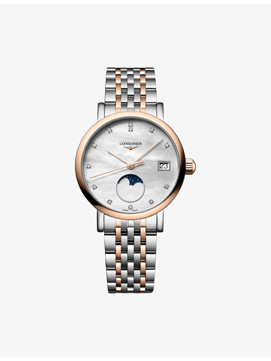 PRODUCT DETAILS - Longines 18ct rose-gold, stainless-steel and 0.040ct diamond quartz watch - Case material: 100% stainless steel; 100% 18ct rose gold - Strap material: 100% stainless steel; 100% 18ct rose gold - Crown material: 100% 18ct rose gold - Style Number: L4.330.5.87.7 - Movement type: quartz - Fastening: triple safety folding clasp and push-piece opening mechanism - Dial: round, white mother-of-pearl - Hands: Pink hands - Index: diamond indexes - Glass: scratch-resistant sapphire crystal, with several layers of anti-reflective coating on both sides - Calibre: L296 - Date window: yes - Technical details: date and moon phase - Stones: 12 Wesselton VS-SI diamonds - Carat weight: 0.040ct total - Case thickness: 8.50mm - Case diameter: 30.00mm - Water resistance: 3 bar / 3 atm / 30m / 100ft - Made in Switzerland - Warranty: 2 years, warranty card and diamond certificate to be included with return. Ref: R04473150