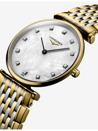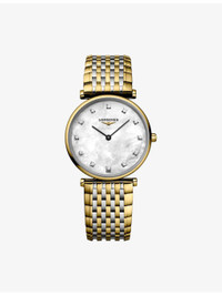 PRODUCT DETAILS - Longines yellow PVD-coated and 0.081ct diamond quartz watch - Case material: 100% yellow PVD coating - Strap material: 100% yellow PVD coating - Crown: 100% yellow PVD coating - Bezel: 100% yellow PVD coating - Style Number: L4.512.2.87.7 - Movement type: quartz - Fastening: triple safety folding clasp and push-piece opening mechanism - Dial: white mother-of-pearl - Index: diamond indexes - Hands: black hands - Glass: scratch-resistant sapphire crystal - Stones: dial set with 12 Top Wesselton VS-SI diamonds, for a total of 0.081 carats - Calibre: L420 - Case thickness: 4.50mm - Case diameter: 29.00mm - Water resistance: Water-resistant to 3 bar (30m) - Made in: Switzerland - Warranty: 2 years - Returns: warranty card & diamond certificate to be included with return Ref: R04525270