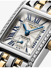 PRODUCT DETAILS - Longines18ct yellow-gold, 0.456ct diamond and stainless-steel quartz watch - Case material: 100% stainless steel set with 38 Top Wesselton IF-VVS diamonds - Strap material: 100% stainless steel, 100% 18ct yellow gold - Crown material: 100% 18ct yellow gold - Style Number: L5.200.5.78.7 - Movement type: quartz - Fastening: triple safety folding clasp and push-piece opening mechanism - Dial: rectangular, silver flinque - Hands: blued steel hands - Index: painted Roman numerals and indexes - Glass: scratch-resistant sapphire crystal, with several layers of anti-reflective coating on both sides - Calibre: L178 - Stones: 38 Wesselton IF-VVS diamonds - Carat weight: 0.456ct total - Case thickness: 6.75mm - Case dimensions: 21.50 x 29.00mm - Water resistance: 3 bar / 3 atm / 30m / 100ft - Made in Switzerland - Warranty: 2 years, warranty card to be included with return. Ref: R04472667
