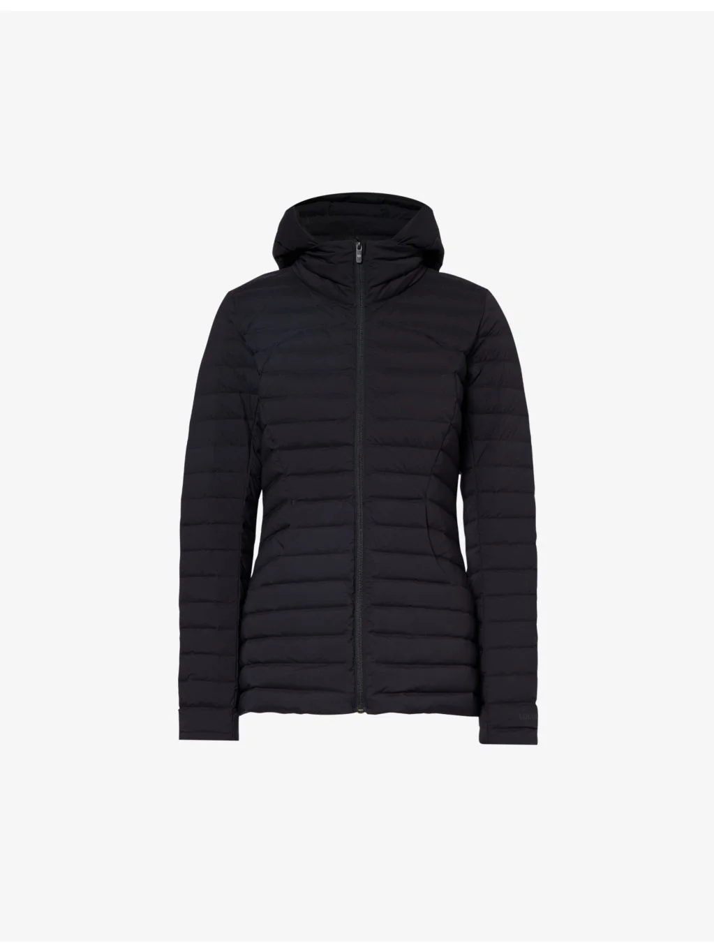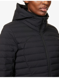 PRODUCT DETAILS - lululemon stretch-woven jacket - 85% nylon, 15% elastane; filling 80% goose down, 20% goose feather - Exposed zip fastening at front - Regular fit, funnel neck, detachable hood, long sleeves, rubberised branding at sleeves, two slip pockets at front, padded - Machine wash cold - True to size - Model is 5ft 9in/1.75m and wears a size UK 8 - Midweight, slight stretch Ref: R04214897
