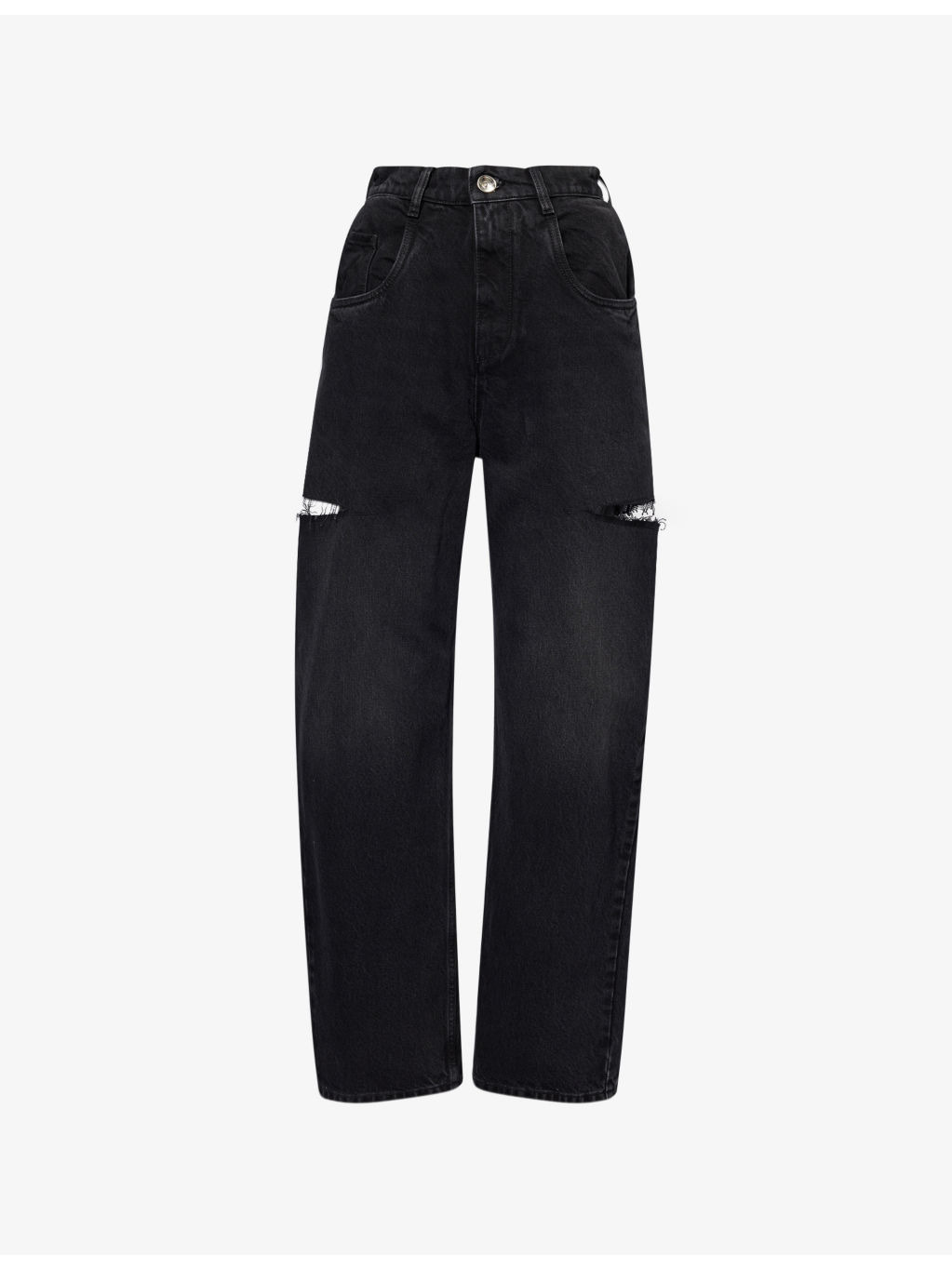 PRODUCT DETAILS - Maison Margiela denim jeans - 100% cotton; pocketlining 100% cotton - Exposed button and concealed zip-fly fastening at front - Relaxed fit, high-rise, wide leg, belt loops, five pockets, cut-out at sides, faded wash - Machine wash at 30°C - Made in Italy - True to size - Size UK 8: rise 14in / 36cm, inside leg 30in / 77cm, leg opening 18in / 46cm - Model is 5ft 10in/1.78m and wears a size UK 8 - Midweight, slight stretch Ref: R04485108