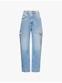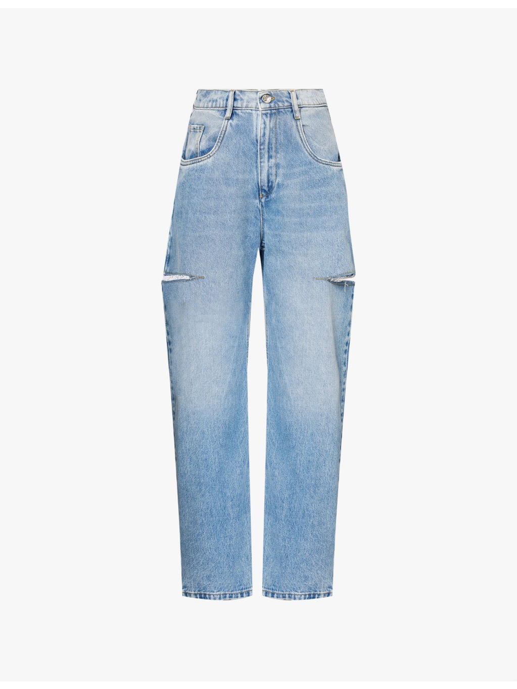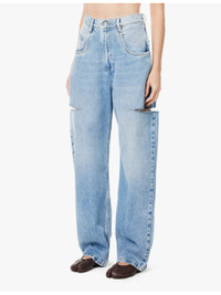 PRODUCT DETAILS - Maison Margiela denim jeans - 100% cotton - Exposed button and concealed zip-fly fastening at front - Regular fit, high rise, straight leg, structured waistband with belt loops, five classic pockets, distressed cut-outs at sides, V-shaped yoke at back, contrast stitching, mid-faded wash, silver-toned hardware - Machine wash cold - True to size - Size UK 8: rise 14in / 36cm, inside leg 30in / 76cm, leg opening 18in / 46cm - Model is 5ft 10in/1.78m and wears a size UK 8 - Midweight, non-stretch Ref: R04333756