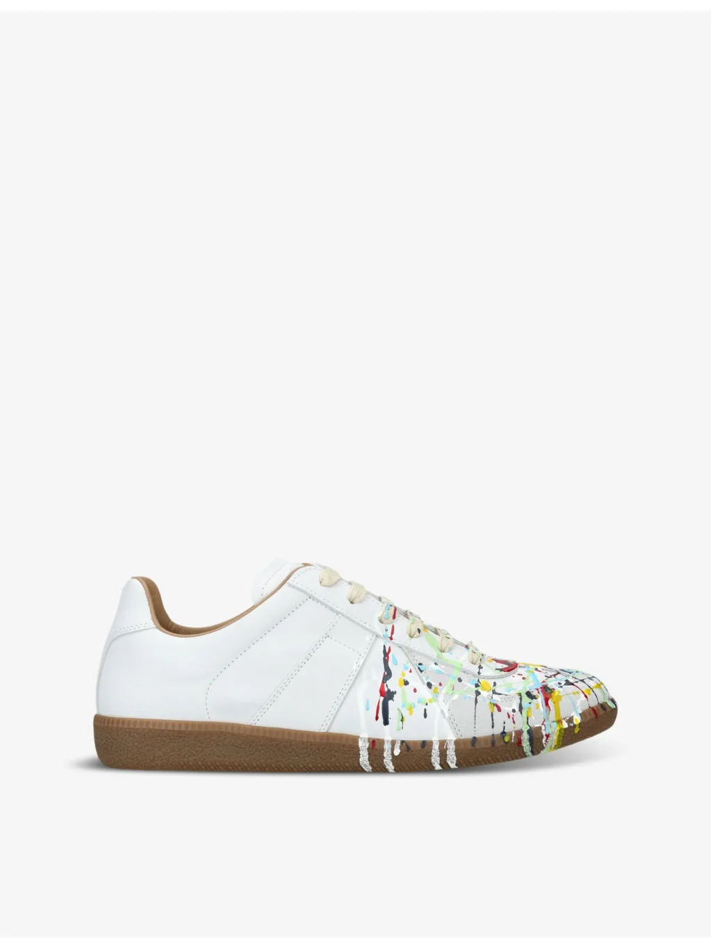 PRODUCT DETAILS - Maison Margiela leather low-top trainers - 100% leather - Lace-up fastening - Round closed toe, paint splatter design, branded insole, contrast sole - Specialist leather clean - Upper: 100% leather - Lining: 100% cotton - Sole: 100% rubber Ref: R04384722