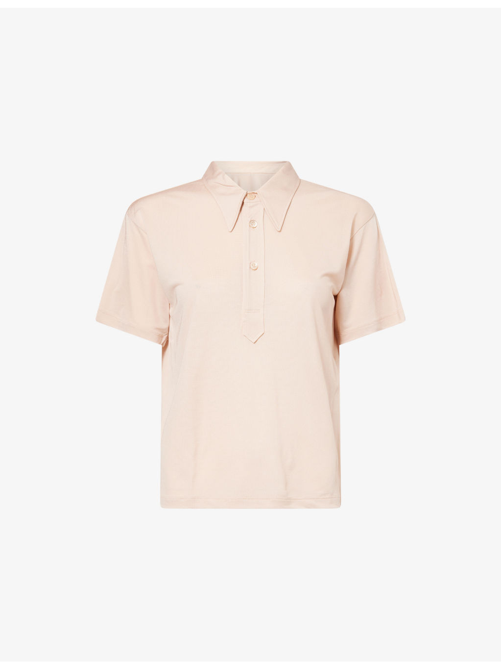PRODUCT DETAILS - Maison Margiela stretch-woven polo shirt - 96% viscose, 4% elastane - Exposed button fastenings at front - Regular fit, straight-point collar, dropped shoulders, short sleeves, three-button placket, branded pearlescent buttons, four-stitch logo at back, slightly sheer finish - Machine wash at 30°C - Made in Italy - True to size - Model is 5ft 10in/1.78m and wears a size small - Lightweight, slight stretch Ref: R04485120-S