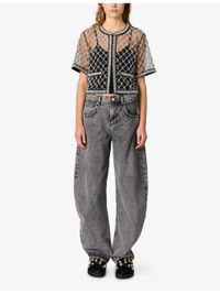 PRODUCT DETAILS - Maje tulle top - 100% polyester - Concealed hook-and-eye fastening at front - Relaxed fit, round neck, short sleeves, all-over bead embroidery, removable tank top with spaghetti straps - Machine wash at 30°C - True to size - Model is 5ft 10in/1.78m and wears a size UK 8 - Lightweight, non-stretch Ref: R04470503
