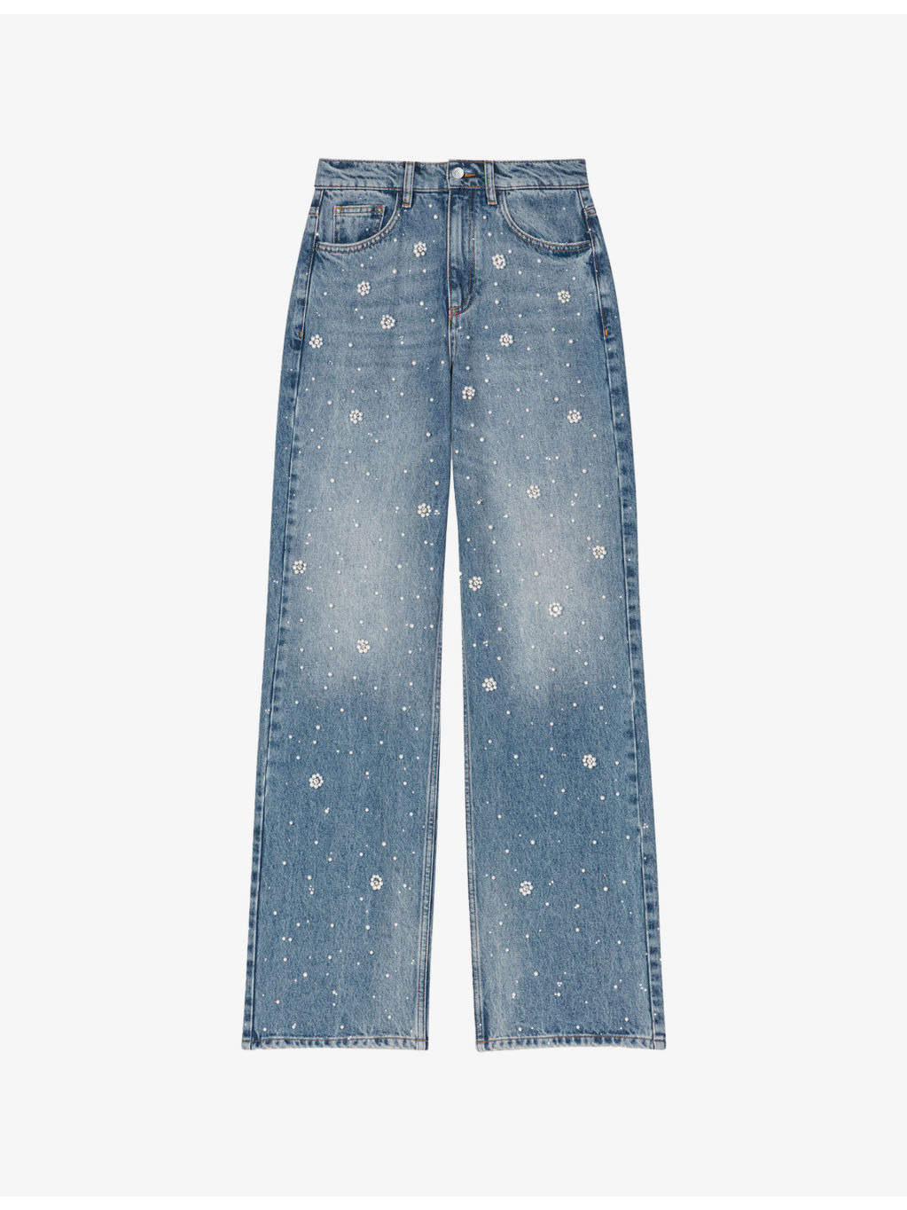 PRODUCT DETAILS - Maje jeans - 100% cotton - Button and zip-fly fastening - Regular fit, high rise, belt loops, five pockets, all-over bead embellishment, wide leg - Hand wash - True to size - Model is 5ft 10in/1.78m and wears a size UK 8 - Midweight, non-stretch Ref: R04529208