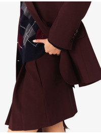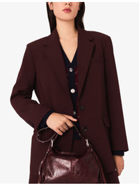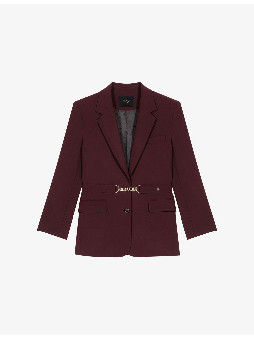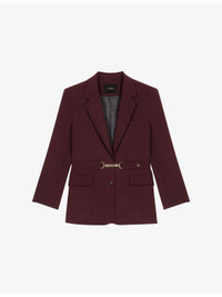 PRODUCT DETAILS - Maje stretch wool-blend blazer - 53% wool, 42% polyester, 5% elastane - Exposed button fastening at front - Slim fit, lapel collar, long sleeves, belted at the waist, gold-tone hardware, two flap pockets at the side - Dry clean - True to size - Model is 5ft 11in/1.80m and wears a size UK 8 - Midweight, slight-stretch Ref: R04514865