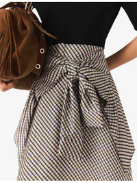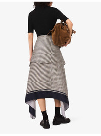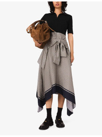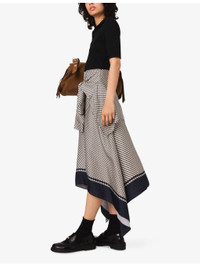 PRODUCT DETAILS - Maje stretch-cotton and woven midi dress - 92% cotton, 8% elastane; skirt 100% viscose - Slim fit, open collar, short sleeves, contrasting satin skirt with all-over floral and bow print, two self-tie long-sleeve panels at front, asymmetric hem, midi length - Hand wash - True to size - Model is 5ft 9in/1.75m and wears a size UK 8 - Lightweight, slight stretch Ref: R04509750