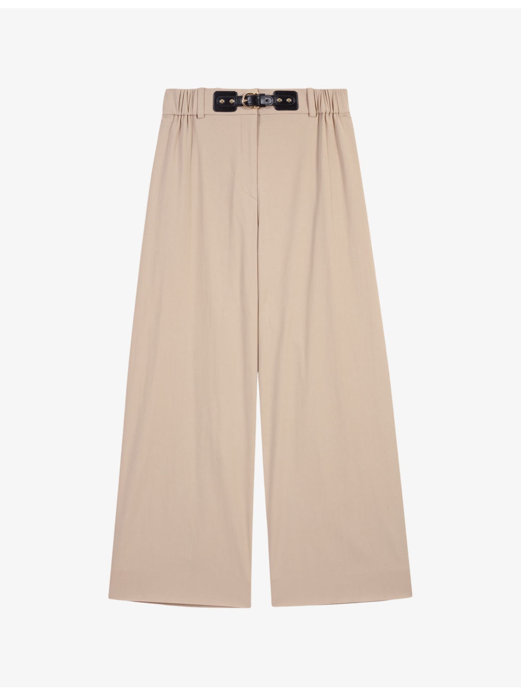 PRODUCT DETAILS - Maje stretch-cotton trousers - 68% cotton, 29% polyamide, 3% elastane - Exposed adjustable buckle fastening at front - Regular fit, high rise, elasticated waist, buckle embellishment at the waist, two pockets at the back, logo embroidery at the back pocket, wide leg - Machine wash cold - True to size - Lightweight, slight stretch Ref: R04320848