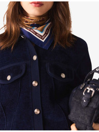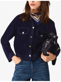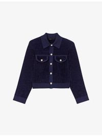 PRODUCT DETAILS - Maje stretch-velvet jacket - 54% viscose, 45% polyamide, 1% elastane - Exposed button fastening at front - Regular fit, classic collar, two flap pockets at the chest, long sleeves, gold-tone hardware, cropped - Hand wash - True to size - Model is 5ft 9in/1.75m and wears a size UK 8 - Midweight, slight stretch Ref: R04532829