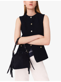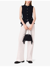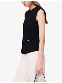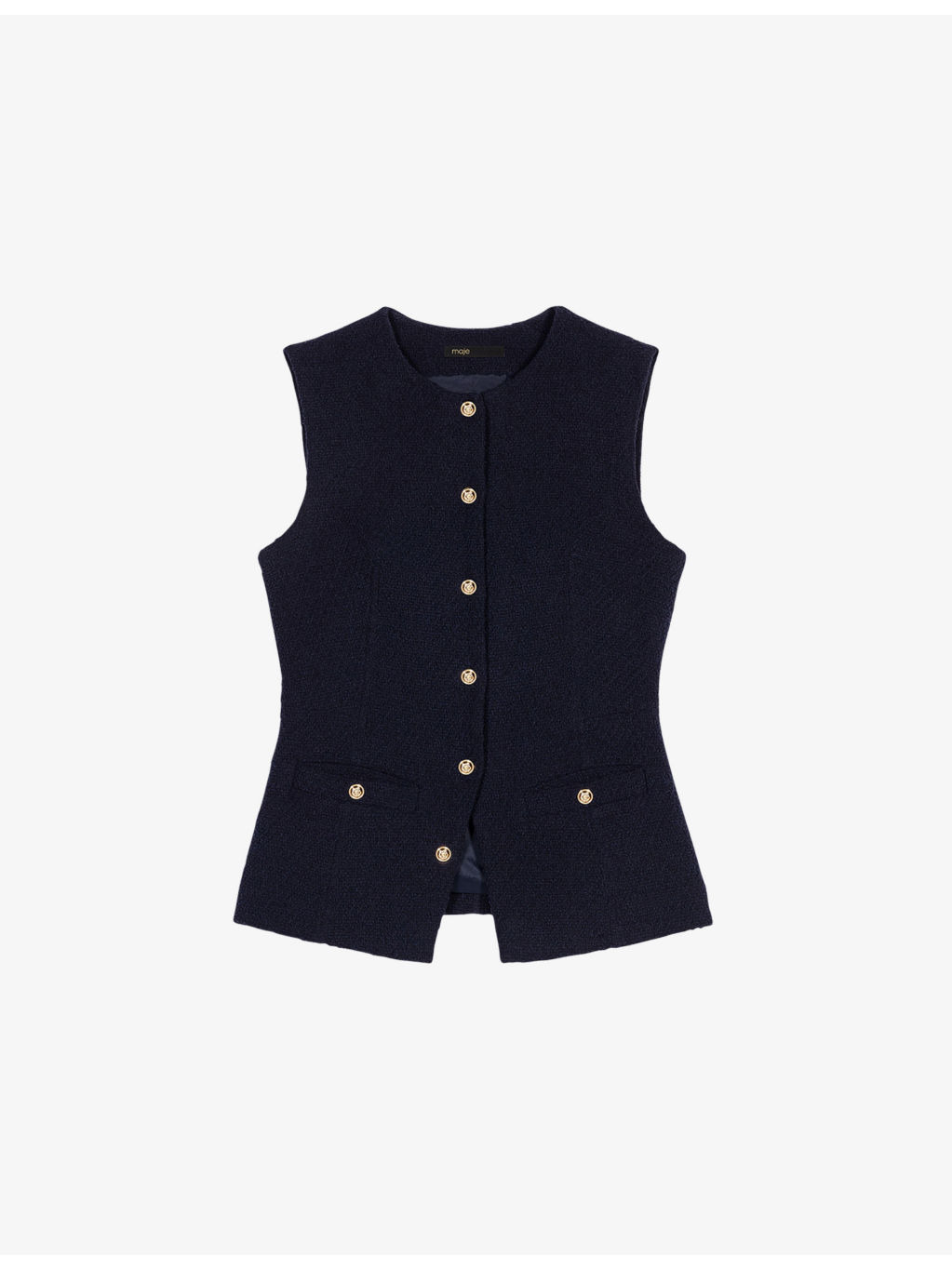 PRODUCT DETAILS - Maje stretch-tweed jacket - 63% cotton, 24% polyester, 12% acrylic, 1% elastane - Exposed button fastening at front - Slim fit, round neck, button-down design, sleeveless, gold-tone hardware, two welt pockets at the side - Dry clean - True to size - Model is 5ft 10in/1.78m and wears a size UK 8 - Midweight, slight stretch Ref: R04495423
