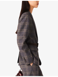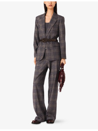 PRODUCT DETAILS - Maje stretch-woven blazer - 41% polyester, 23% acrylic, 17% wool, 14% viscose, 3% elastane, 2% polyamide - Exposed button fastening at front - Regular fit, lapel collar, long sleeves, belted waist, all-over check pattern, two flap pockets at the side - Dry clean - True to size - Model is 5ft 11in/1.80m and wears a size UK 8 - Midweight, non-stretch Ref: R04514849