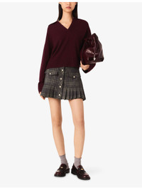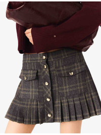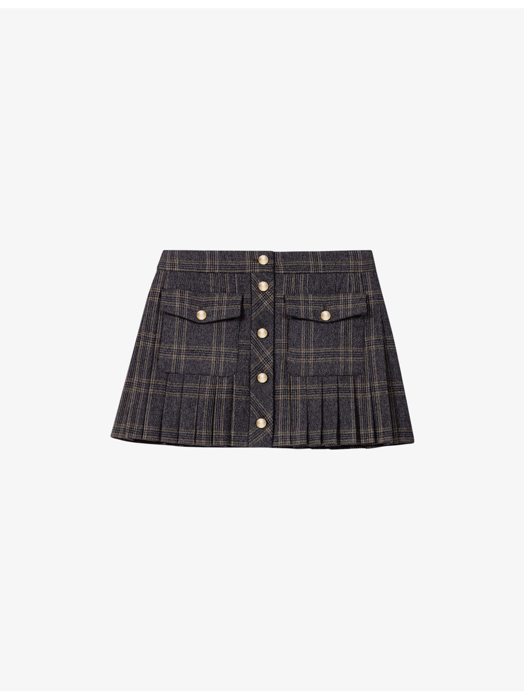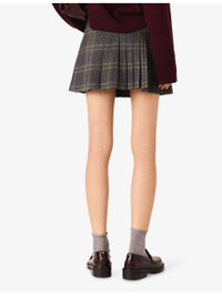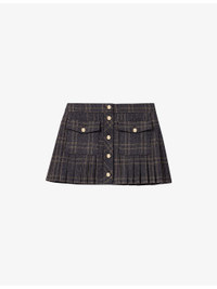 PRODUCT DETAILS - Maje woven mini skirt - 41% polyester, 23% acrylic, 17% wool, 14% viscose, 3% elastane, 2% polyamide - Button fastening - Regular fit, mid-rise, side pockets, pleated hem, all-over checked pattern - Dry clean - True to size - Model is 5ft 11in/1.80m and wears a size UK 8 - Lightweight, non-stretch Ref: R04514861
