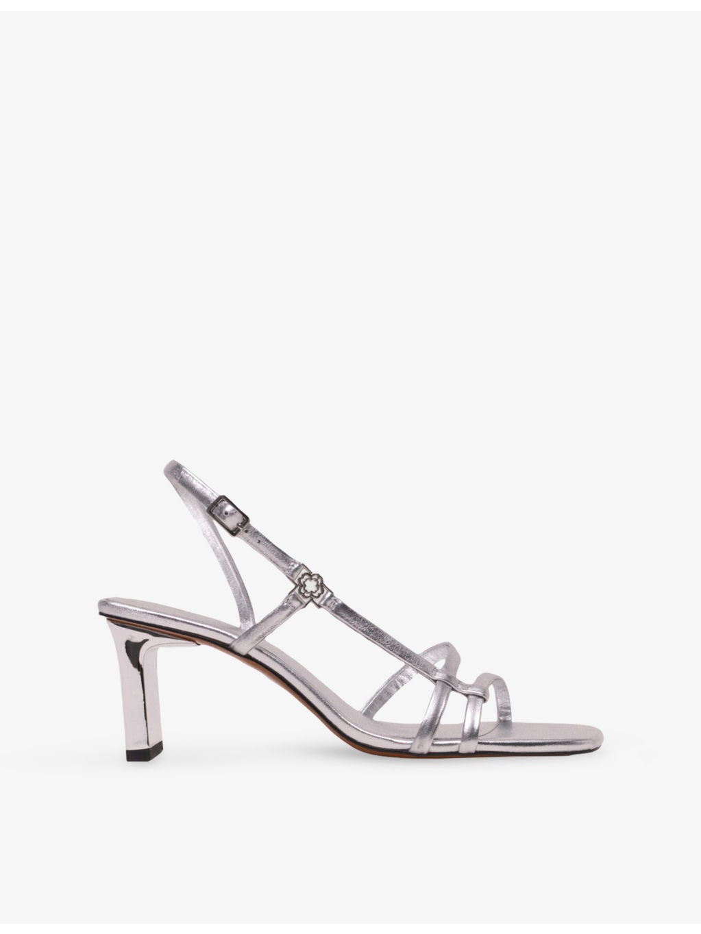 PRODUCT DETAILS - Maje metallic-leather heeled sandals - 100% leather - Adjustable buckle fastening - Open square toe, metallic upper, thin straps, slingback strap with clover embellishment, silver-toned hardware, covered heel - Heel height 2.3” - Specialist leather clean - Upper: 100% leather - Lining: 100% leather - Sole: 100% resin Ref: R04490910