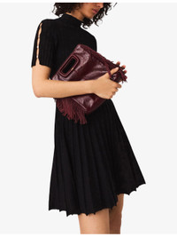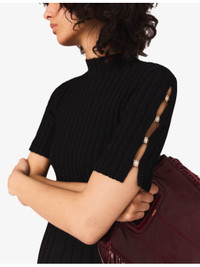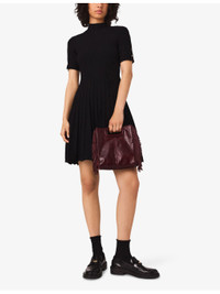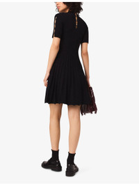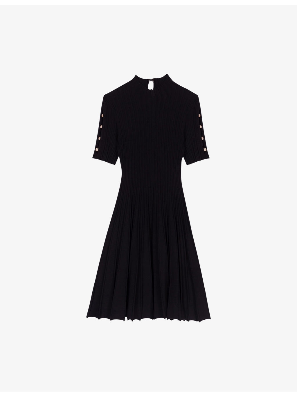 PRODUCT DETAILS - Maje stretch-knit dress - 66% viscose, 32% polyamide, 2% elastane - Slips on - Slim fit, high neck, short sleeves with clover-embellished fastenings, fitted waist, flared skirt - Hand wash - True to size - Model is 5ft 9in/1.75m and wears a size UK 8 - Midweight, slight stretch Ref: R04490300
