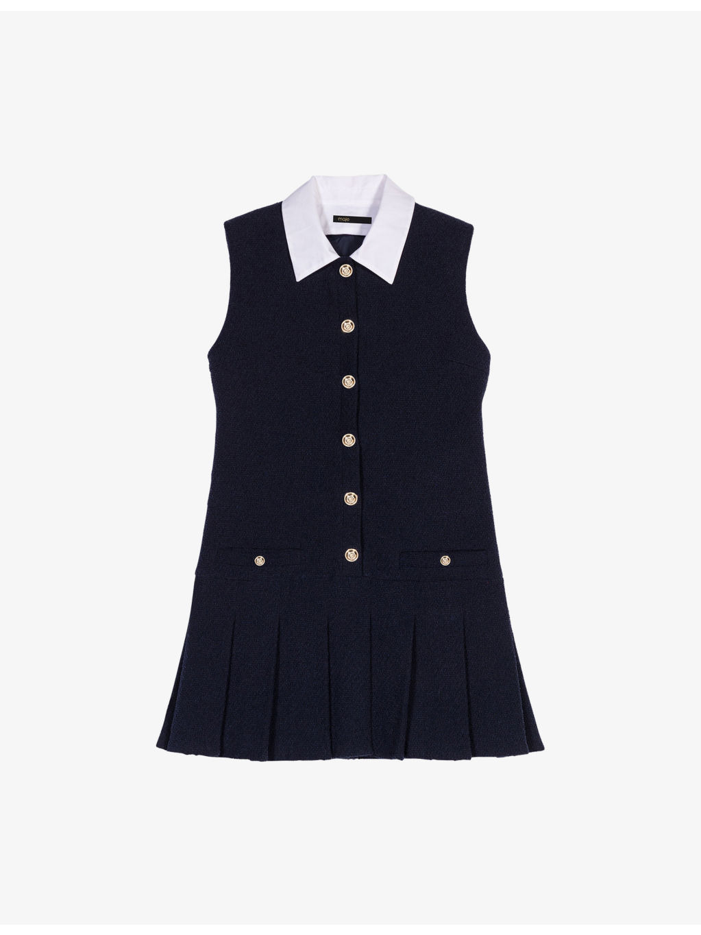 PRODUCT DETAILS - Maje cotton-blend mini dress - 63% cotton, 24% polyester, 12% acrylic, 1% elastane; lining 94% polyester, 6% elastane; band lining 100% cotton; secondary material 100% cotton - Exposed popper fastenings at front - Regular fit, detachable contrasting collar, engraved metal buttons at front, all-over tweed texture, two welt pockets with button embellishments, pleated skirt, mini length - Dry clean only - True to size - Model is 5ft 10in/1.78m and wears a size UK 8 - Midweight, slight stretch Ref: R04495425
