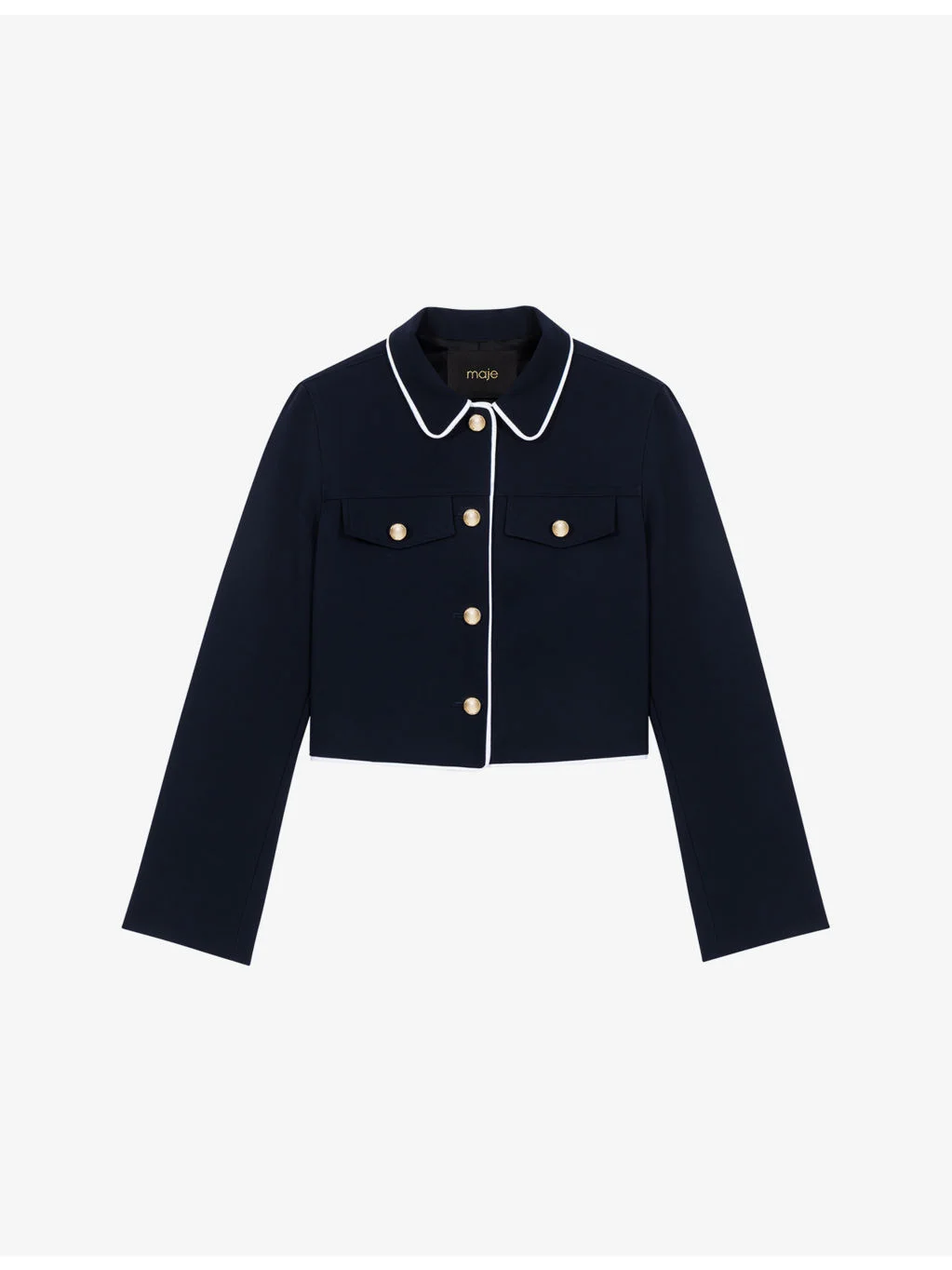 PRODUCT DETAILS - Maje cotton-blend jacket - 62% cotton, 36% polyester, 2% elastane; piping 100% viscose - Exposed button fastening at front - Regular fit, collar, long sleeves, two buttoned mock pockets at chest, contrast trims, cropped hem - Dry clean only - True to size - Model is 5ft 10in/1.78m and wears a size UK 8 - Midweight, slight stretch Ref: R04598259