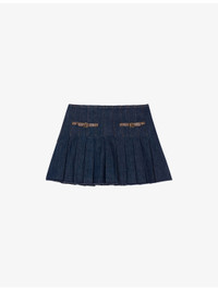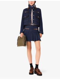 PRODUCT DETAILS - Maje stretch-denim skirt - 99% cotton, 1% elastane - Concealed zip fastening - Regular fit, high rise, two adjustable buckles at the side, pleated design, lined with shorts - Machine wash at 30°C - True to size - Model is 5ft 10in/1.78m and wears a size UK 8 - Midweight, slight stretch Ref: R04514826