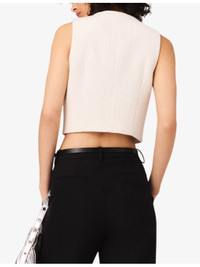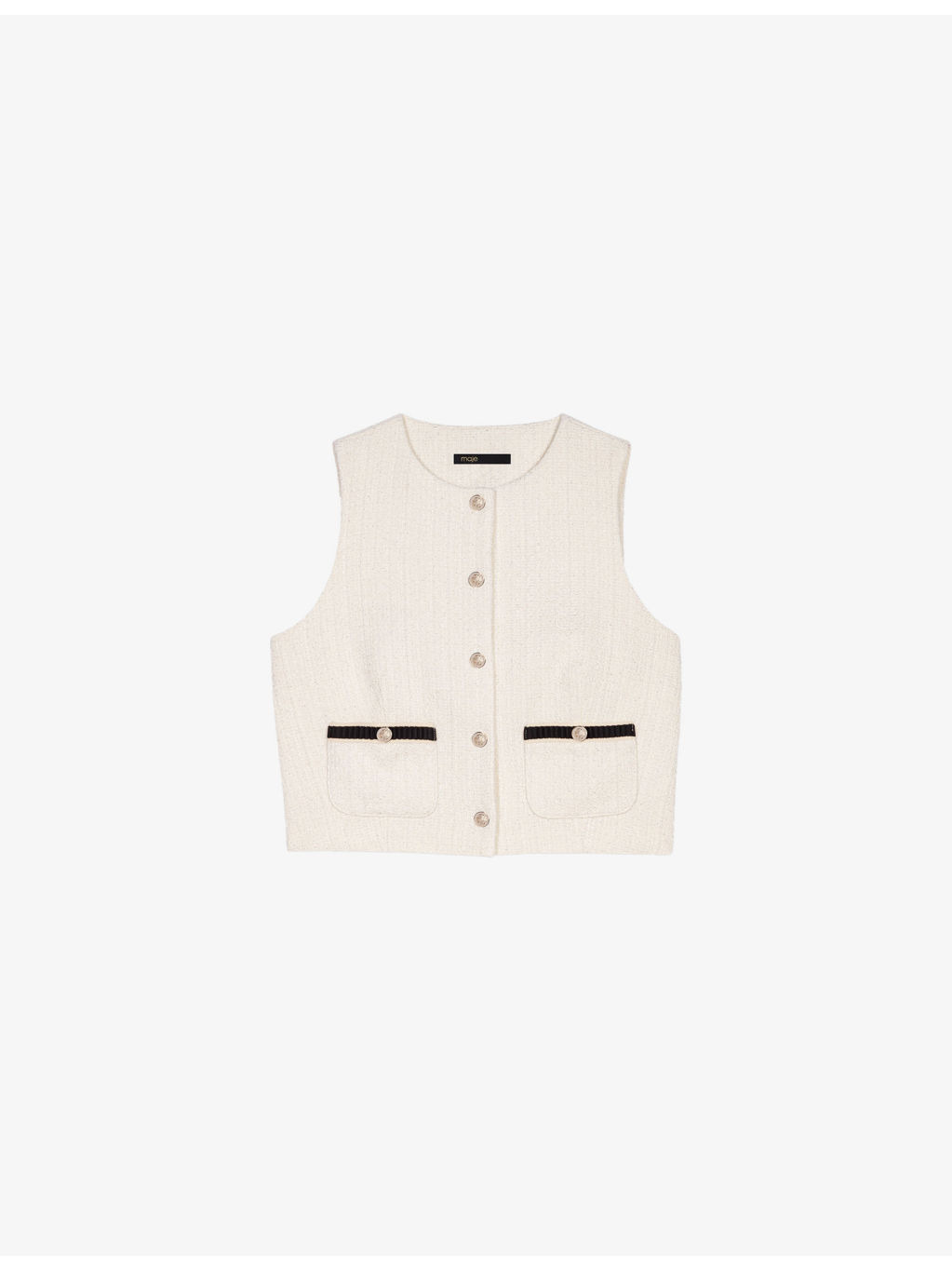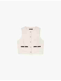 PRODUCT DETAILS - Maje tweed top - 60% cotton, 20% polyester, 14% acrylic, 3% polyamide, 2% viscose, 1% metalized fibers - Exposed button fastening at front - Regular fit, round neck, button-down design, sleeveless, two welt pockets at the side, gold-tone hardware - Hand wash - True to size - Model is 5ft 9in/1.75m and wears a size UK 8 - Midweight, slight stretch Ref: R04495424