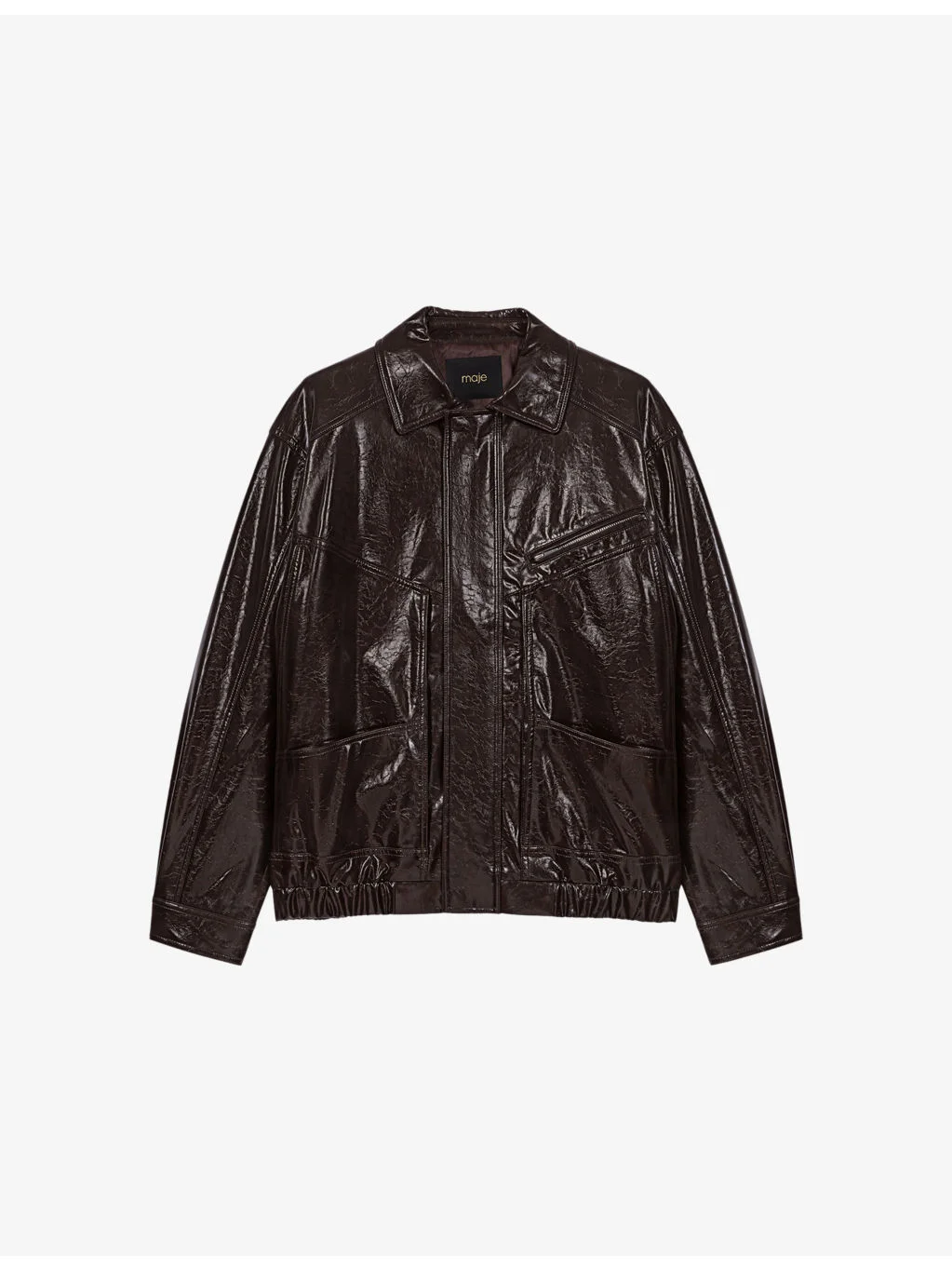PRODUCT DETAILS - Maje faux-leather jacket - 100% viscose - Concealed zip fastening - Relaxed fit, collared, long sleeves, two pockets at the side, cracked design - Dry clean - True to size - Model is 5ft 11in/1.80m and wears a size UK 8 - Midweight, non-stretch Ref: R04522382