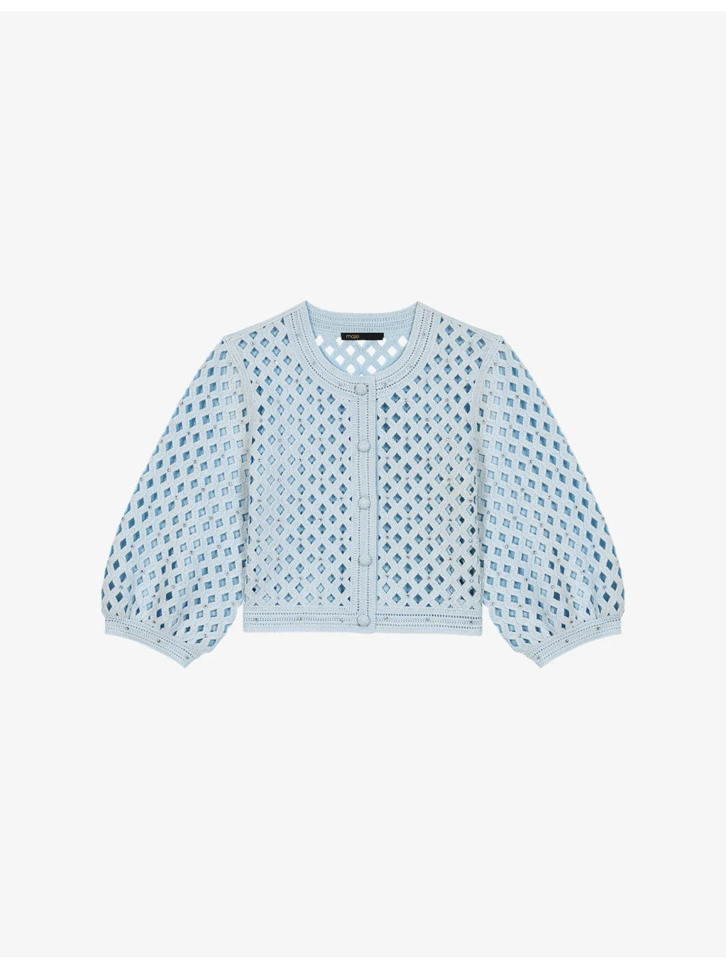 PRODUCT DETAILS - Maje woven cardigan - 100% polyester - Exposed button fastening at the front - Regular fit, round neck, three-quarter sleeves, rhinestone embellishment, crochet design - Hand wash - True to size - Midweight, non-stretch Ref: R04597467