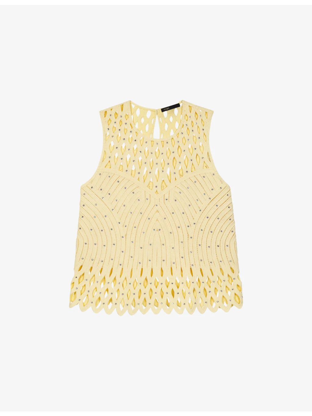 PRODUCT DETAILS - Maje woven top - 100% polyester - Concealed hook-and-eye and zip fastening at back - Regular fit, round neck, sleeveless, all-over rhinestone embellishment, crochet design - Hand wash - True to size - Midweight, non-stretch Ref: R04597466
