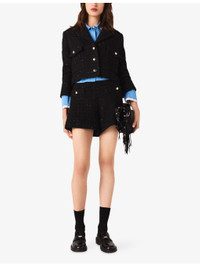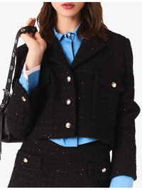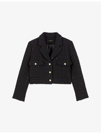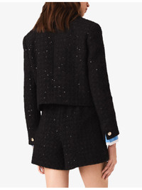 PRODUCT DETAILS - Maje tweed jacket - 47% cotton, 44% polyester, 6% acrylic, 3% wool - Button fastening - Regular fit, notch lapels, single-breasted, long sleeves, buttoned cuffs, chest pockets, cropped, all-over sequin embellishment - Dry clean - True to size - Model is 5ft 9in/1.75m and wears a size UK 8 - Midweight, non-stretch Ref: R04532894