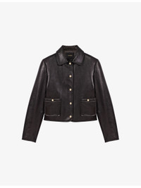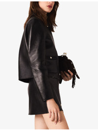 PRODUCT DETAILS - Maje leather jacket - 100% leather - Button fastening - Regular fit, collar, long sleeves, side pockets, cropped - Specialist leather clean - True to size - Model is 5ft 9in/1.75m and wears a size UK 8 - Heavyweight, non-stretch Ref: R04533228