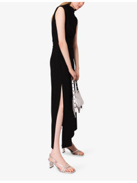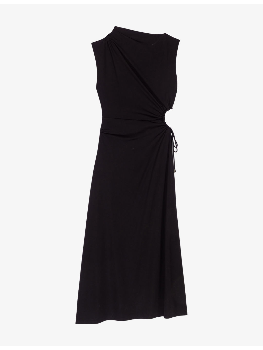 PRODUCT DETAILS - Maje stretch-woven dress - 58% viscose, 35% polyamide, 7% elastane - Self-tie fastening - Slim fit, high neck, asymmetrical draped effect, drawstring cut-out at the side - Machine wash at 30°C - True to size - Model is 5ft 10in/1.78m and wears a size UK 8 - Lightweight, slight stretch Ref: R04495412