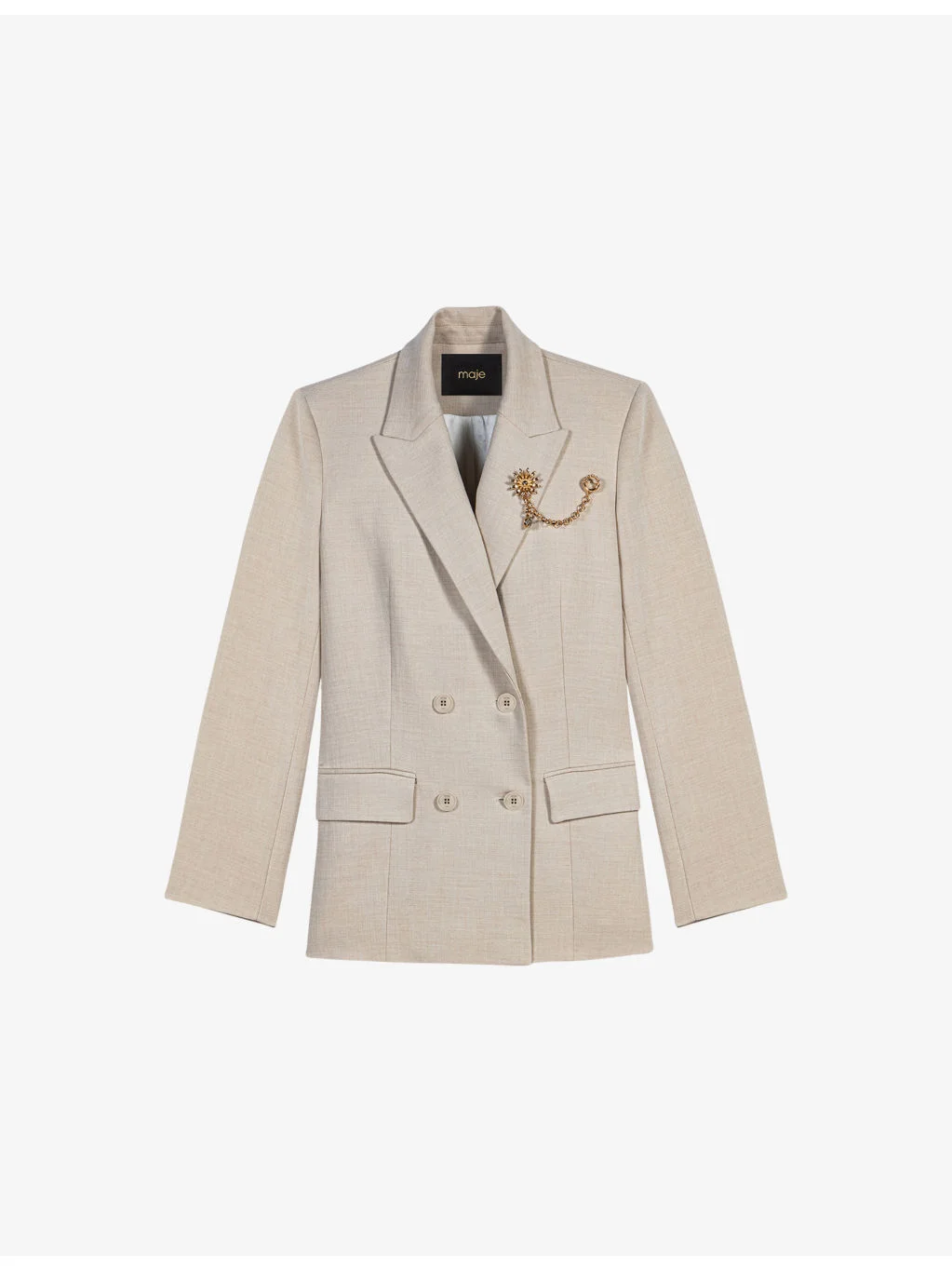 PRODUCT DETAILS - Maje woven blazer - 80% viscose, 19% polyester, 1% elastane - Button fastening - Regular fit, double-breasted, peak lapels, long sleeves, buttoned cuffs, side pockets, detachable brooch embellishment - Dry clean - True to size - Model is 5ft 9in/1.75m and wears a size UK 8 - Midweight, non-stretch Ref: R04598231