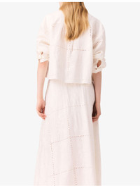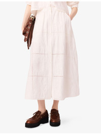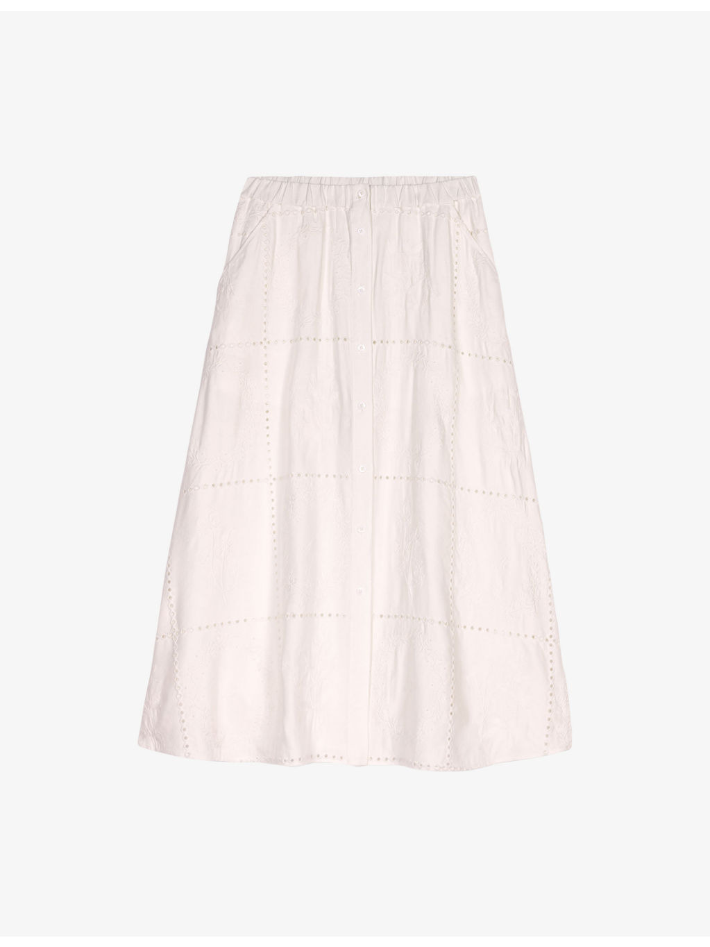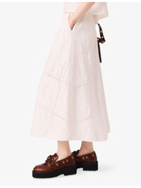 PRODUCT DETAILS - Maje linen-blend skirt - 54% linen, 46% viscose - Exposed button fastening at front - Regular fit, elasticated waist, button-down design, all-over embroidery - Hand wash - True to size - Model is 5ft 10in/1.78m and wears a size UK 8 - Lightweight, non-stretch Ref: R04491726