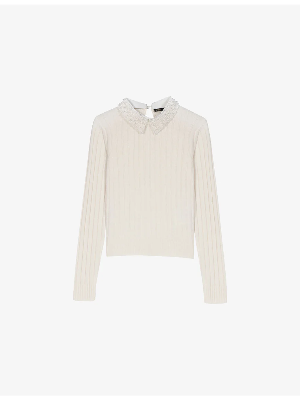 PRODUCT DETAILS - Maje wool-blend jumper - 94% wool, 5% polyamide, 1% elastane - Button fastening - Regular fit, faux-pearl embellished collar, long sleeves, ribbed texture - Hand wash - True to size - Midweight, slight stretch Ref: R04578860