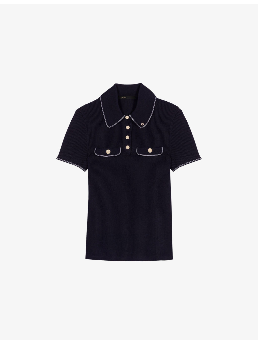 PRODUCT DETAILS - Maje stretch-knit polo shirt - 56% viscose, 42% polyamide, 2% elastane - Exposed popper fastenings at front - Slim fit, collar, short sleeves, clover embellishment at collar, two buttoned flap pockets at chest, all-over ribbed texture - Hand wash - True to size - Lightweight, slight stretch Ref: R04495395