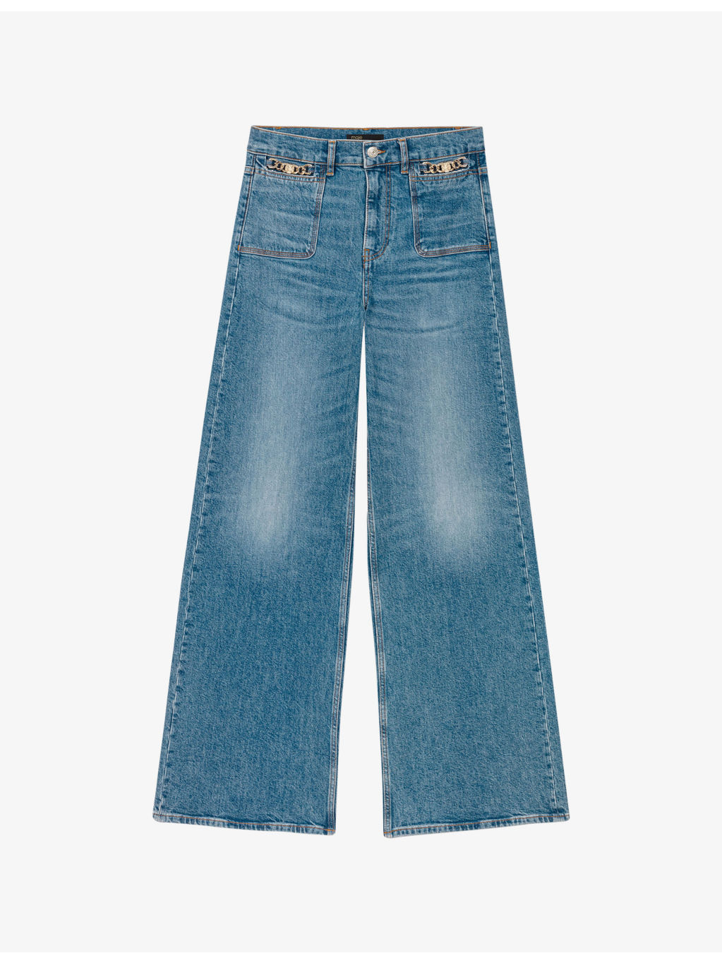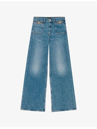 PRODUCT DETAILS - Maje stretch-denim jeans - 99% cotton, 1% elastane - Exposed button and zip-fly fastening at front - Regular fit, mid-rise, belt loops, chain embellishment, five pockets, flared leg - Machine wash at 30°C - True to size - Model is 5ft 9in/1.75m and wears a size UK 8 - Midweight, slight-stretch Ref: R04532839