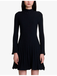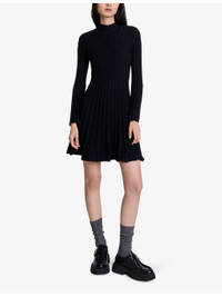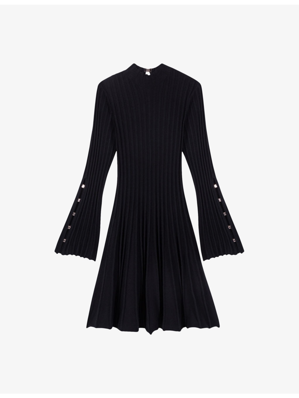 PRODUCT DETAILS - Maje stretch-knit dress - 33% polyester, 31% polyamide, 18% acrylic, 16% wool, 2% elastane - Slips on - Slim fit, high neck, long flared sleeves, flared skirt, all-over ribbed detail - Hand wash - True to size - Model is 5ft 10in/1.78m and wears a size UK 8 - Midweight, slight stretch Ref: R04327667