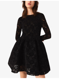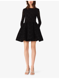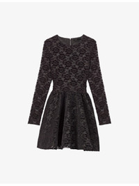 PRODUCT DETAILS - Maje stretch-velvet dress - 61% polyester, 34% polyamide, 5% elastane - Exposed zip fastening at back - Slim fit, round neck, long sleeves, all-over velvet lace design, flared skirt - Machine wash at 40°C - True to size - Model is 5ft 9in/1.75m and wears a size UK 8 - Midweight, slight-stretch Ref: R04532828